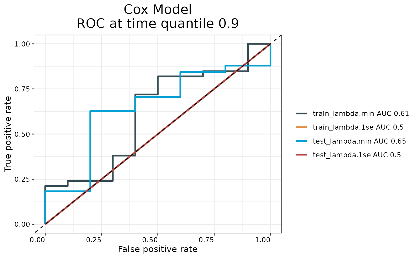 Generates time-dependent ROC curves for evaluating prognostic accuracy of survival models. Plots training and testing ROC curves at the 90th percentile survival time.