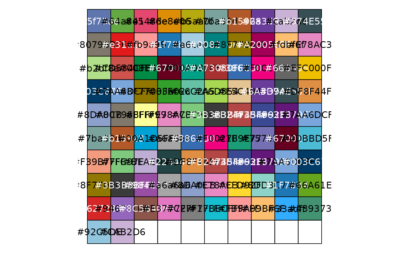 #> [1] "'#5f75ae', '#64a841', '#e5486e', '#de8e06', '#b5aa0f', '#7ba39d', '#b15928', '#6a3d9a', '#cab2d6', '#374E55FF', '#80796BFF', '#e31a1c', '#fb9a99', '#1f78b4', '#a6cee3', '#008280FF', '#8F7700FF', '#A20056FF', '#fdbf6f', '#E78AC3', '#b2df8a', '#CD534CFF', '#008B45FF', '#67001F', '#00A087FF', '#A73030FF', '#386CB0', '#F0027F', '#666666', '#EFC000FF', '#003C67FF', '#7AA6DCFF', '#8F7700FF', '#33a02c', '#66C2A5', '#A6D854', '#E5C494', '#6A3D9A', '#374E55FF', '#DF8F44FF', '#8DA0CB', '#80796BFF', '#FFFF99', '#E78AC3', '#7FC97F', '#3B3B3BFF', '#B24745FF', '#3B4992FF', '#631879FF', '#7AA6DCFF', '#7ba39d', '#b15928', '#00A1D5FF', '#a6a6a6', '#386CB0', '#F0027F', '#1B9E77', '#7570B3', '#67001F', '#4DBBD5FF', '#F39B7FFF', '#7FC97F', '#BEAED4', '#224444', '#DF8F44FF', '#B24745FF', '#3B4992FF', '#631879FF', '#7AA6DCFF', '#003C67FF', '#8F7700FF', '#3B3B3BFF', '#984EA3', '#a6a6a6', '#8DA0CB', '#E78AC3', '#FFD92F', '#8DD3C7', '#1F78B4', '#66A61E', '#D62728FF', '#9467BDFF', '#8C564BFF', '#E377C2FF', '#7F7F7FFF', '#17BECFFF', '#FB9A99', '#FDBF6F', '#33adff', '#439373', '#92C5DE', '#CAB2D6'"