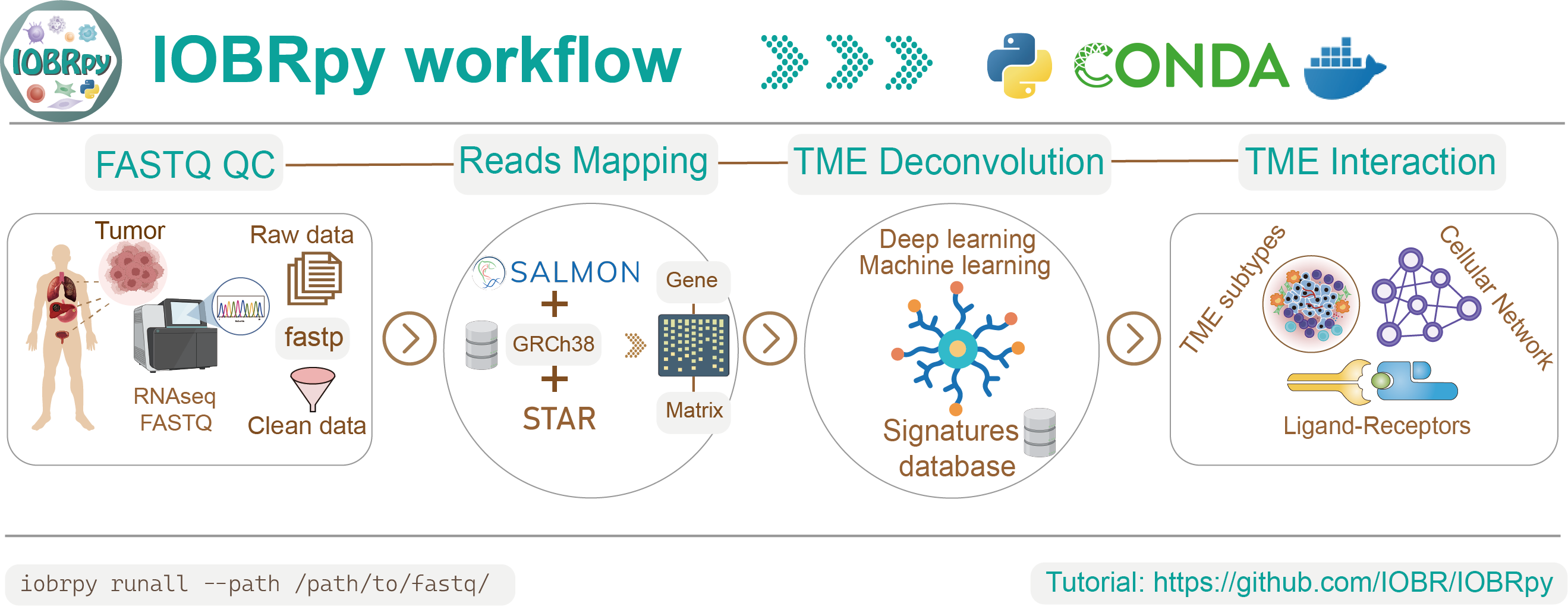 IOBRpy is a command-line toolkit for bulk RNA-seq tumor microenvironment (TME) analysis. It wires together FASTQ QC, quantification (Salmon or STAR), matrix assembly, signature scoring, immune deconvolution, clustering, and ligand–receptor scoring.