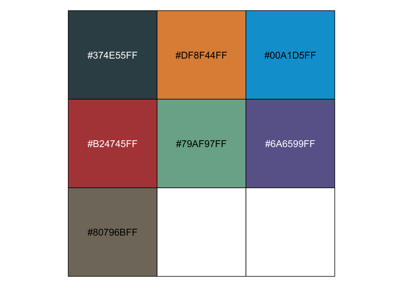 ## [1] "'#374E55FF', '#DF8F44FF', '#00A1D5FF', '#B24745FF', '#79AF97FF', '#6A6599FF', '#80796BFF'"